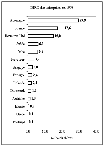 L'écart des dépenses de recherche des entreprises françaises et des entreprises allemandes, est au demeurant important en valeur absolue. Ainsi, si l'écart entre l'Allemagne et la France était de 56 % en 1998 pour la DIRD globale, les entreprises allemandes ont dépensé 70 % de plus que les entreprises françaises en R&D pendant la même année. Figure 34 : Dépenses des entreprises en R&D en 1998 (milliards d'écus)